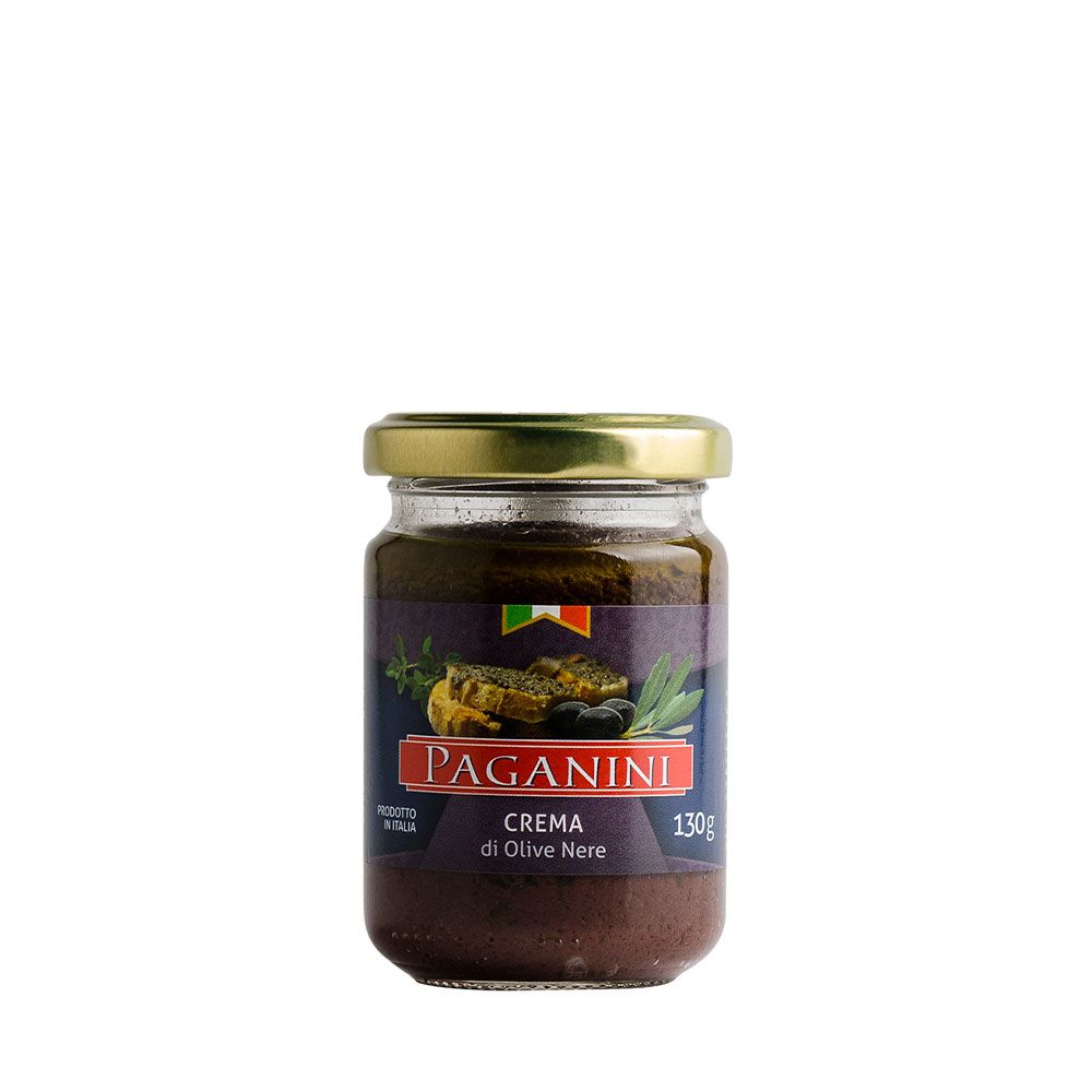 Creme de azeitonas pretas. Contém azeitonas pretas, sal, azeite extravirgem e manjerona.